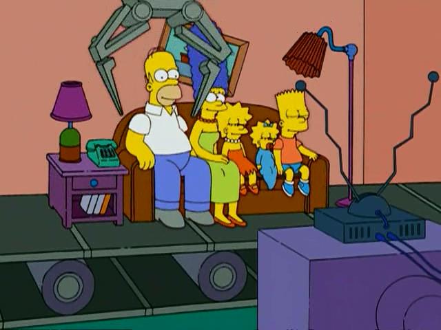 Le canapé arrive sur un tapis roulant, toute la famille est déjà installée sauf Homer qui est déposé par une pince métallique. Puis le tapis redémarre et le canapé s'éloigne.