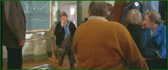 › Pour attirer l'attention sur lui et faire taire le brouhaha ambiant afin de prendre la parole Bart/Quint fait crisser ses ongles sur un tableau noir sur lequel est dessiné un cochon/un requin.