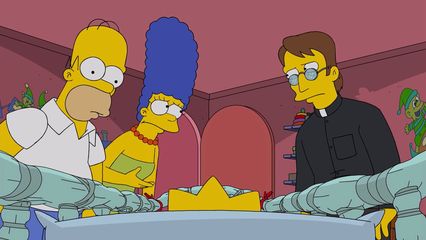 L'introduction craint. The exor-sis : Ce premier acte est presque parfait, pile poil ce que j'attendrais d'une parodie de l'exorciste question intrigue. Seul ombre au tableau : Top court. Au niveau des gags, la réaction des objets dans la chambre c'est du bon boulot, et le "merci" de Marge quand Ellen se fait tuer m'a bien fait rire. Les couleurs et éclairages de cette histoire sont vraiment bons. Coralisa : Les choses vont très vite, peut-être un peu trop. Cela dit je loue le look et l'animation de l'autre monde. Question ambiance c'est plutôt réussi, au niveau des gags, le petit rappel du premier acte, la référence au Simpson Horror Show VI, Wiggum et la chute de l'histoire sont sympas. Cette fin d'épisode est finalement très raccord avec les épisodes d'Halloween historiquement, un bon n'importe quoi. Appréciable. MMM... Homer : Oh, bien joué, c'est assez répugnant pour les standards de la série, mais j'apprécie l'audace. Il y a de bonnes répliques, de bonnes références, et les deux précédentes histoires étant plus courtes, on prend un peu plus son temps ici. Malheureusement, la fin, avoir une guest pour résoudre tout ça, bof bof. Dommage car en dehors de ça, la chute n'est pas si mal. Un épisode pur Halloween, pas mal de bons gags, 3 intrigues qui finissent dans un bon n'importe quoi, loin d'être parfait mais pas si mal globalement.