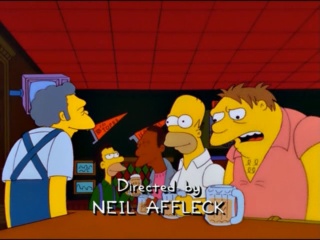 On n'a pas souvent eu droit à des épisodes avec Barney au premier plan (voire même quasiment jamais, surtout dans les saisons récentes) et cette fois, on peut dire que c'est bien négocié. Ce n'est en rien parfait mais c'est sympathique car l'histoire A est bien foutue sans tomber dans la dinguerie excessive, Homer apporte de bonnes répliques (faut dire, il était encore assez savoureux à l'époque) et la plupart des gags sont très drôles, comme Moe qui espionne la factrice ou Barney qui habite au-dessus de chez Moe. L'histoire B est amusante elle aussi (le placard avec les objets faisant référence à d'autres épisodes me plait toujours autant) et suffisamment courte mais perd en rythme dès l'incendie. Mais dans l'absolu, c'est un bon épisode.