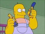 Les Simpson se placent derrière un paravent représentant le canapé et la famille, avec des trous à la place de leurs têtes. Ils mettent leurs têtes derrière chacun des trous mais se trompent de place.